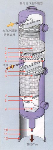 圖1:1、規(guī)整填料 2、支撐柵板 3、液體收集器 4、集液環(huán) 5、多級槽式液體分布器 6、填料壓圈 7、支撐柵板 8、蒸汽入口管 9、塔底 10、至再沸器循環(huán)管 11、裙座 12、底座環(huán)